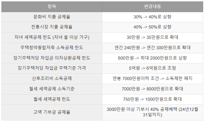 올해 연말정산 공제 항목별 공제율이 달라졌으니 반드시 확인하시길 바랍니다. 특히 신용카드 전통시장 및 문화비 사용액 공제율을 상향시켰으니 공제될 부분이 커진거라 꼭 체크하고 가야 합니다. 또한 식대 비과세 한도가 월 20만 원으로 확대되었습니다. 자녀가 있는 집에서는 자녀세액공제 대상 연령이 만 8세 이상으로 조정되었고, 교육비 세액공제 대상(수능응시료, 대학입학전형료가 추가)이 확대되었습니다.
